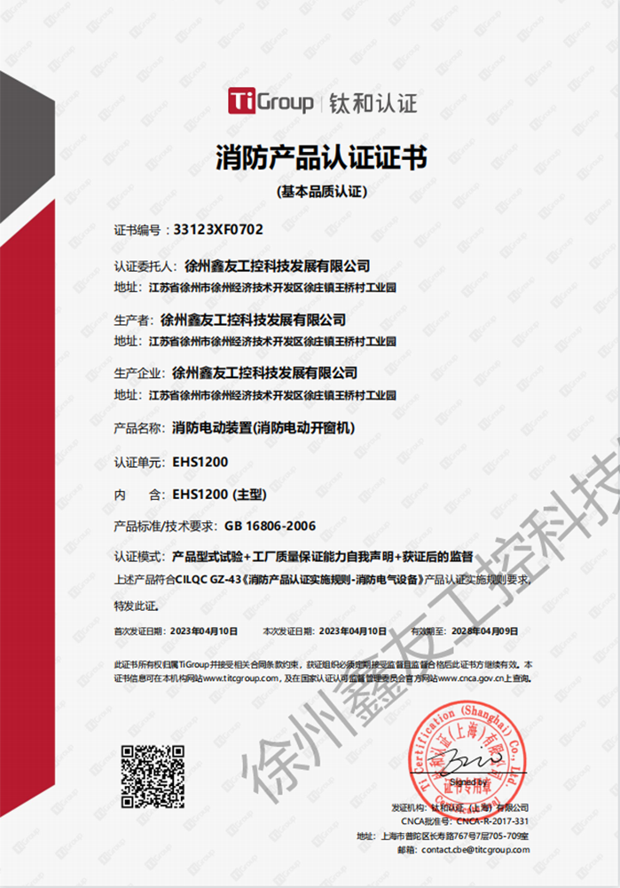 徐州鑫友工控科技發(fā)展有限公司成立于2008年,占地31600平方米,全資子公司:江蘇良紫工程科技有限公司,旗下 有“鑫友”及“MASTER.W主人窗控”兩個(gè)品牌系列,公司全面貫徹執(zhí)行IS09001:2015質(zhì)量管理體系標(biāo)準(zhǔn),產(chǎn)品順利通過歐盟CE認(rèn)證和中國***消防電子產(chǎn)品認(rèn)證,通過可燃性粉塵環(huán)境下、爆炸性環(huán)境下防爆合格產(chǎn)品檢驗(yàn)。排煙天窗整窗通過***消防產(chǎn)品質(zhì)量監(jiān)督檢驗(yàn)中心檢測。先后獲得多項(xiàng)******及榮譽(yù)證書。集研發(fā)、加工、生產(chǎn)、制造、銷售、安裝及售后于一體,是一家高起點(diǎn)、研發(fā)能力強(qiáng)的專業(yè)智能化***技術(shù)企業(yè)。